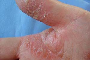 随着病情逐渐的发展,红斑扩散面积变大,表皮开始角质化,角质化脱落后边缘处层层叠叠,红斑处有新皮生成,过不久新皮又会开始角质化,皮损可以对称,也可以不对称。同时脓疱也会由粟米大小变成绿豆至黄豆大小,患者自己身上所长出来的脓疱大小比较一致,脓疱的生成速度比较快,数个小时就可以生成,有不同程度的自觉症状。脓疱的数目根据人不同,数目也不同,部分患者患处脓疱遍布密集,破裂之后结成厚厚的黄褐色脓痂,包裹着患处,更有甚者整个手脚都被脓痂包裹,动则脓痂破裂,就有鲜血溢出。