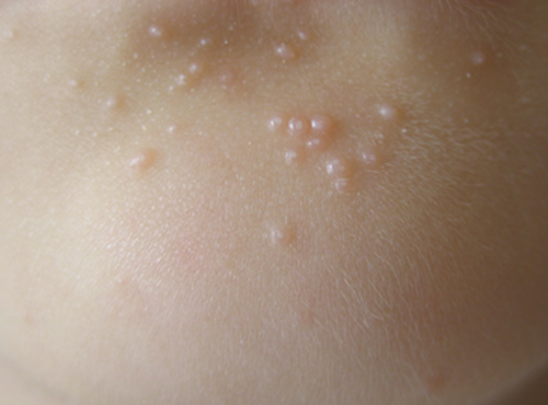 传染性软疣,俗称“水瘊子”,是由传染性软疣病毒感染所致的传染性皮肤病,儿童多见。典型的皮损为3-5mm大小的半球形丘疹,呈灰色或珍珠色,表面有蜡样光泽,中央有脐凹,内涵乳白色干酪样物质即疣状小体。搔抓后,皮损可沿着抓痕呈条状或串状排列,称同形反应。