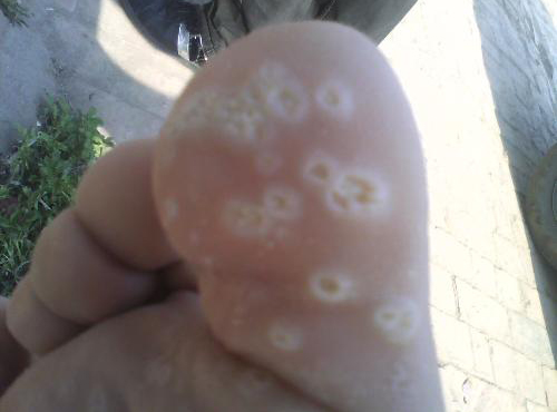 足底部出现丘疹,患者可自觉疼痛,也可无任何症状。