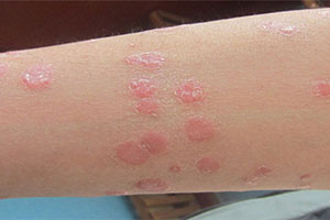 2、银屑病患处形状很有特点。银屑病患处的红斑形状各异,急性期的银屑病患处形状呈点滴状;静止期患处呈斑块状或出现针头至扁豆大的扁平丘疹,随着病情的加重,患处红疹会逐渐增大至钱币,患处有红斑,红斑上覆有多层银白色鳞屑,将鳞屑轻轻刮除会露出一层薄膜,将薄膜刮除,则出现点状出血症状。