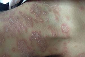 二继发斑表现:母斑出现后经过数天或两个月后,在躯干及四肢近端可见多数与母斑相同而形状较小的红斑称为子斑或继发疹,皮损横列呈椭圆形,而且长轴与皮纹走行一致,中心有细微的皱纹,皮损的境界比较清楚,边缘不整略呈锯齿状,一般不会融合,表面附有少量白色糠状细小鳞屑。继发疹出现后,母斑则逐渐变淡,一般性质干燥,没有湿润倾向。