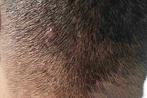1.头面部脂溢性皮炎:多首发于头部,最初表现为灰白色糠秕状或油腻性鳞屑斑片,以后逐渐扩展融合成边界清楚的大斑片,甚至累及大部分头皮。鳞屑呈干燥的粉末状或油腻鳞片状,可伴轻度红斑或针头大小红色毛囊丘疹、渗出及厚痂。严重者全头皮均覆有油腻性臭味厚痂,并伴有脱发。头额、眶上、眼睑、鼻唇沟尤甚,为黄红色或油腻性鳞屑斑疹。眶上部眉及其周围弥漫性红斑、脱屑,眉毛因搔抓而稀少。眼睑受累呈睑缘炎,睑缘有细小的白色鳞屑覆盖,严重时可成溃疡,愈后有瘢痕和睫毛毛囊破坏。鼻唇沟也可见黄红色或油腻性鳞屑斑片,间有皲裂,皲裂可以在单侧或双侧,多见于女孩或青年女性。另外,胡须部位损害有两种类型,一种是毛囊口轻度红肿、发炎伴有小的淡褐色结痂常称“须疮”,顽固难治。另一种表现为播散性红色、油腻性鳞屑,合并感染时可有脓疱、毛囊炎。脓疱形成较深,累及整个毛囊,导致毛囊破坏与瘢痕形成,偶有头皮及趾骨部同时累及。
