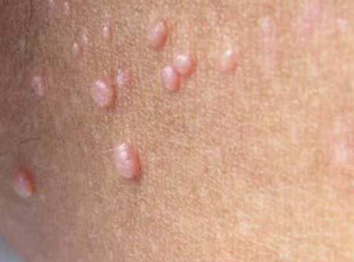 单发或多发,圆形或半球形,有蜡样光泽,中心脐凹状,并含有干酪样栓塞物,丘疹呈肉色或粉红色。初期质地坚硬,成熟变软,可挤压出干酪样物。埋伏期1周至6个月。典型损伤为受感染部分表皮细胞增生构成的丘疹,直径2~8mm。