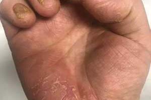 4、皮损的颜色随着时间延长由黄色变为深褐色。5~7天后脓疱吸收,表皮增厚变硬,失去弹性,呈片状鳞屑,周边游离中心固着,边缘和中心发生皲裂、表皮脱落后,下方有红色嫩薄的表皮,病变严重时为点状糜烂,渗液较多,类似湿疹改变。持续数周到数月。