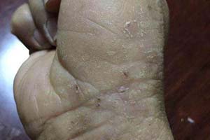 中医认为掌跖脓疱病主要是风邪、湿邪、热邪客于肌肤而成。湿热蕴于掌跖部位肌肤,就很容易造成经络淤堵,经络淤堵则气血运行受阻,养分不能输送,垃圾不能排出,加之风邪鼓燥,就在掌跖皮肤形成了黄白色脓疱,又疼又痒。湿邪重浊、黏滞,热邪伤阴、动风、动血加之风邪游走不定,故而患者的掌跖脓疱病时好时发,时轻时重,缠绵难愈。