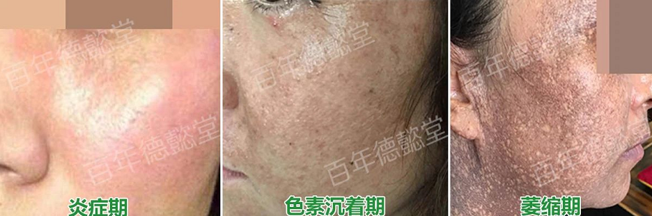 3.萎缩期:黑斑色素持续加深,轻度角化和细薄的鳞屑,像面部撒了一层粉面。像极了秋后晒好的柿子饼,所以被称为柿子饼现象也称撒面现象。