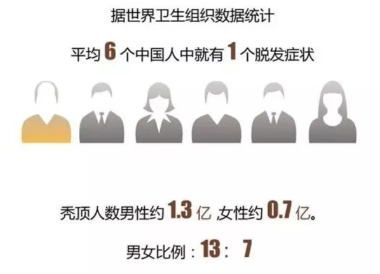 据世界卫生组织数据统计:平均6个中国人中就有1个受脱发困扰。其中男性脱发人数约1.3亿,女性约0.7亿。