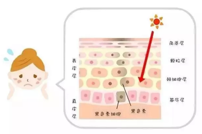 紫外线照射会使皮肤中的细胞得到氧化,从而分泌大量的黑色素,导致了黑色素的积累,使脸上长出斑点。